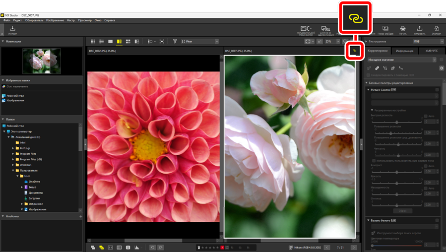 Сравните снимки, расположенные рядом друг с другом. Этот режим можно использовать для сравнения снимков из одной серии или других почти идентичных снимков с целью выбора лучшего кадра.