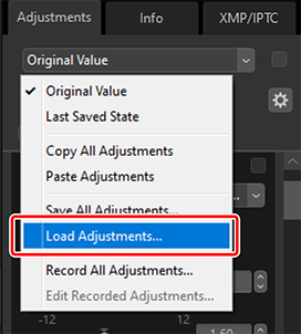 - Ladda sparade justeringar från en justeringsfil och tillämpa dem på bilderna i det aktuella valet.
