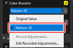 De aktuella inställningarna kan läggas till menyerna i varje verktyg. Inställningarna kan sedan väljas från menyn och tillämpas på andra bilder. Texten som följer använder verktyget [Color Booster (Färgbooster)] i illustrerande syfte.