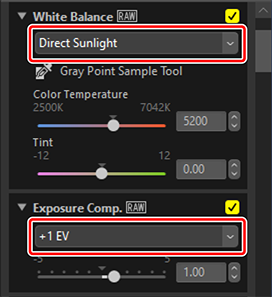 Justera inställningar i justeringspaletten. Här har vi ställt in [White Balance (Vitbalans)] på [Direct Sunlight (Direkt solljus)] och [Exposure Comp. (Exponeringskomp.)] på [+1 EV].