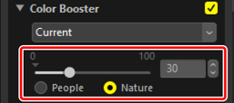 Välj ett verktyg och justera inställningarna i justeringspaletten. Här har vi valt [Nature (Natur)] och ställt in skjutreglaget på +30.