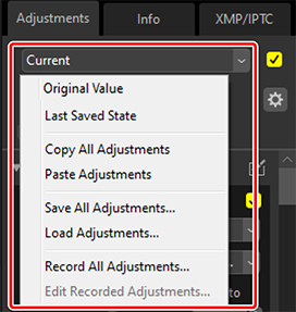 Verktyget för justeringshanteraren på justeringsfliken kan användas för att kopiera eller spara justeringar och tillämpa dem på andra bilder. Flera justeringar kan tillämpas samtidigt (0 Tillämpa justeringar på flera bilder samtidigt).