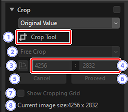 - Bildens aktuella storlek. Värdet uppdateras för att återspegla den nya storleken efter att bilden beskurits.