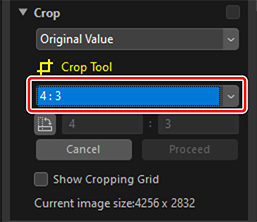 - Välj beskärningens bildförhållande. För att välja en beskärning utan fast bildförhållande väljer du [Free Crop (Fri beskärning)].