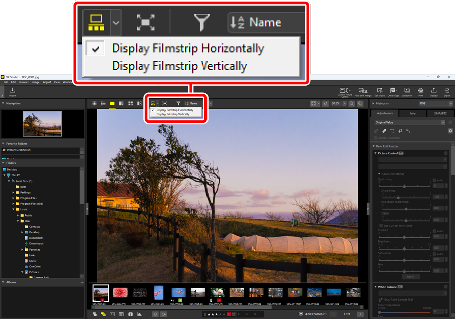 -knappen i det övre verktygsfältet för att visa en rad eller kolumn med miniatyrbilder (“bildbandet”) nedanför eller till vänster om visaren i bildvisaren, “2/4 bilder” och före-och efter-visningar.