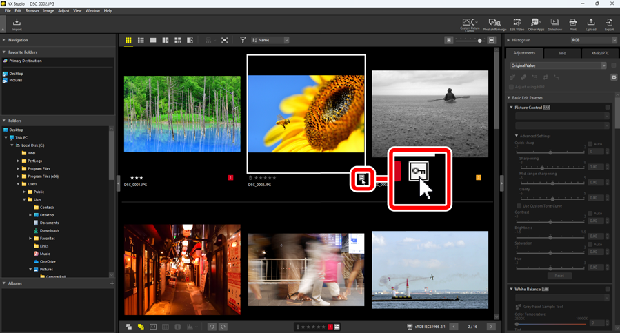 Skyddade bilder kan inte raderas eller döpas om. Bilder som skyddats med kameran är även skyddade i NX Studio.