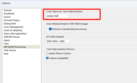 Välj önskat alternativ för [NEF (RAW) Processing (NEF (RAW)-bearbetning)] > [Color Space for Color Reproduction (Färgrymd för färgåtergivning)] i dialogrutan alternativ (0 Dialogrutan Alternativ, [NEF (RAW) Processing (NEF (RAW)-bearbetning)]).