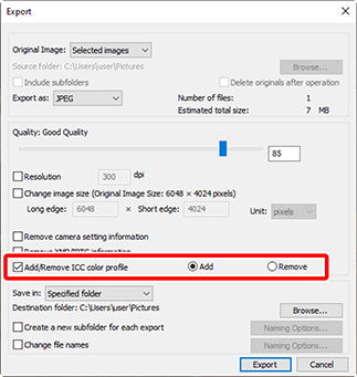 Välj [Export (Exportera)] > [Add/Remove ICC color profile (Lägg till/ta bort ICC-färgprofil)] och välj [Add (Lägg till)].