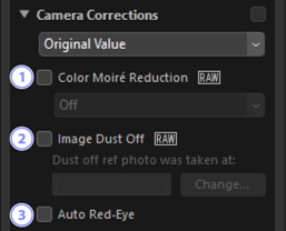Korrigera för moaré, damm på bildsensorn och röda ögon. Detta verktyg visas inte när [Adjust using HDR (Justera med HDR)] är aktiverat.
