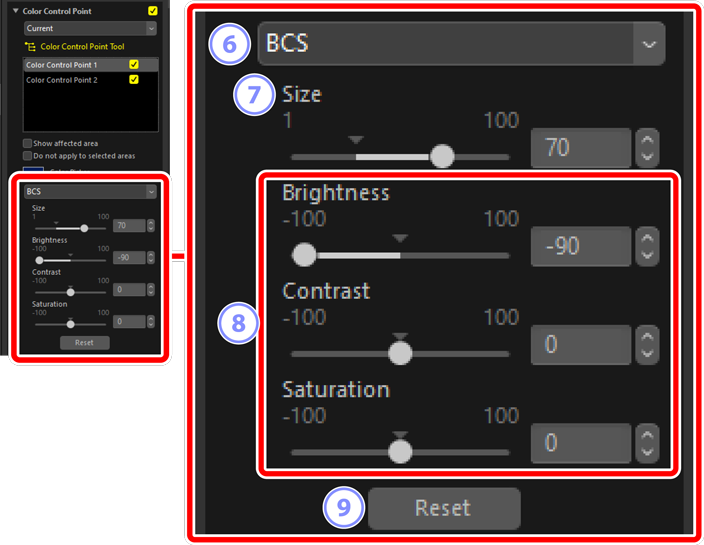 - Inaktivera justeringsreglagen för den valda kontrollpunkten. Det förhindrar även att ändringar av andra kontrollpunkter påverkar färgerna i det valda området. Storleken på det skyddade området kan justeras med hjälp av storleksreglaget.