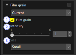 - Kornmönstret ser annorlunda ut varje gång du väljer eller avmarkerar [Film grain (Filmkornighet)]-objektet även när du ställer in [Intensity (Intensitet)] och [Size (Storlek)] på samma värde. Filmkornsmönstret ser annorlunda ut på RAW- och JPEG-bilder när [Film grain (Filmkornighet)] tillämpas på bilder tagna i RAW + JPEG-format.