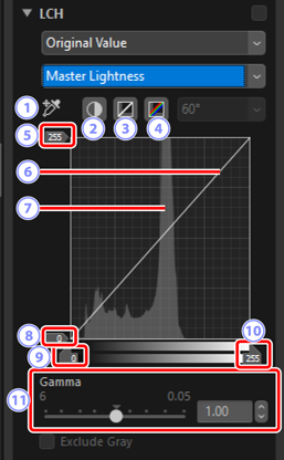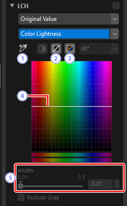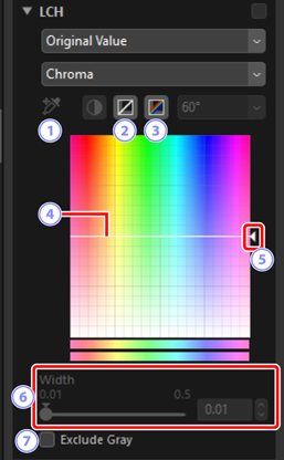 Justera kanalerna för ljushet, färgstyrka och nyans. Välj en kanal med hjälp av menyn i LCH-verktyget. Tillgängliga alternativ varierar med kanalen som valts. LCH-verktyget visas inte när [Adjust using HDR (Justera med HDR)] är aktiverat.