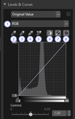 - Klicka på denna knapp och sedan på bilden för att lägga till punkter till kurvorna för alla kanaler som motsvarar värdena för pixeln under markören.