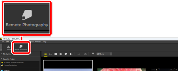 Om NX Tether är installerat kan programmet startas genom att klicka på [Remote Photography (Fjärrfotografering)] i verktygsfältet.