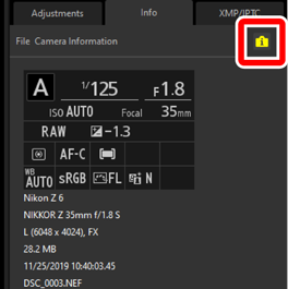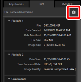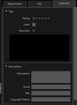Redigera XMP/IPTC-metadata, inklusive etiketter och betyg. Ändringar av etiketter och betyg i visningsområdet eller menyn [Image (Bild)] återspeglas på fliken [XMP/IPTC].