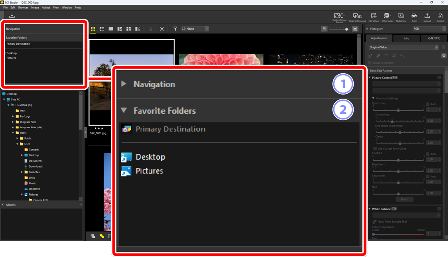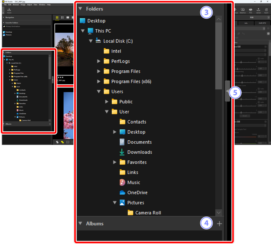 Underpaletterna [Navigation (Navigering)], [Favorite Folders (Favoritmappar)], [Folders (Mappar)] och [Albums (Album)] kan visas eller döljas genom att klicka på
