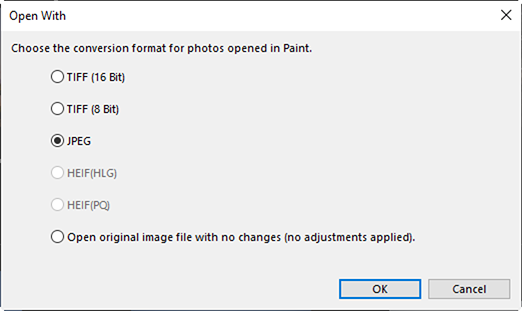 - [Open original image file with no changes (no adjustments applied) (Öppna ursprunglig bildfil utan ändringar (inga justeringar tillämpas))]: Filerna öppnas i sina ursprungliga format. Förbättringar som gjorts i NX Studio kommer inte att tillämpas.