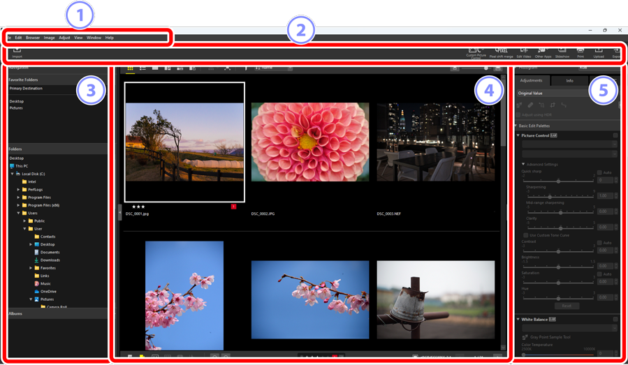 - En hierarkisk visning av mapparna på datorn. Klicka på mappar för att visa de bilder de innehåller i visningsområdet.