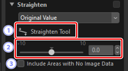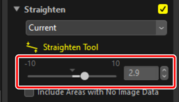 Att räta upp bilder lägger till områden som inte innehåller några bilddata. Med standardinställningarna beskärs bilder automatiskt för att ta bort tomma hörn. Om du istället väljer [Include Areas with No Image Data (Inkludera områden utan bilddata)] fylls de tomma hörnen med svart.