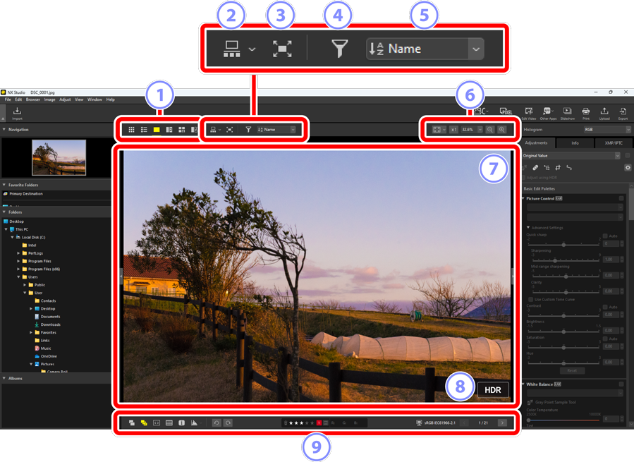 Bilder visas i visningsområdet. Du har ett urval av visningslägen. Förutom miniatyr- och enbildsvisning finns även jämförelsevyer för sida-vid-sida och före-och-efter-redigering.