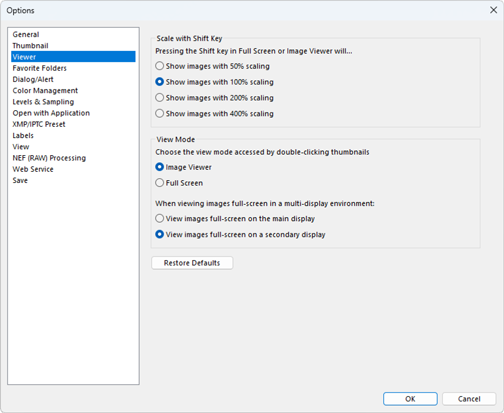 - [Choose the view mode accessed by double-clicking thumbnails (Välj visningsläget som nås genom att dubbelklicka på miniatyrbilder)]: Välj om bilden ska visas i helskärm eller i bildvisaren när du dubbelklickar på en miniatyrbild i miniatyrbildsrutnätet eller -listan.