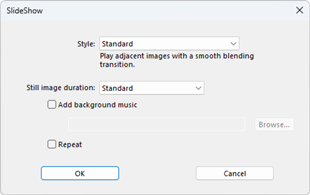 Alternativen i dialogrutan [SlideShow (Bildspel)] styr hur länge bilder ska visas, övergångarna mellan bilder och andra bildspelsinställningar. När du har justerat inställningarna klickar du på [OK] för att starta bildspelet.