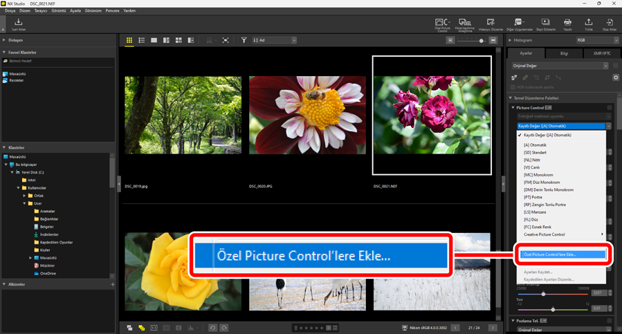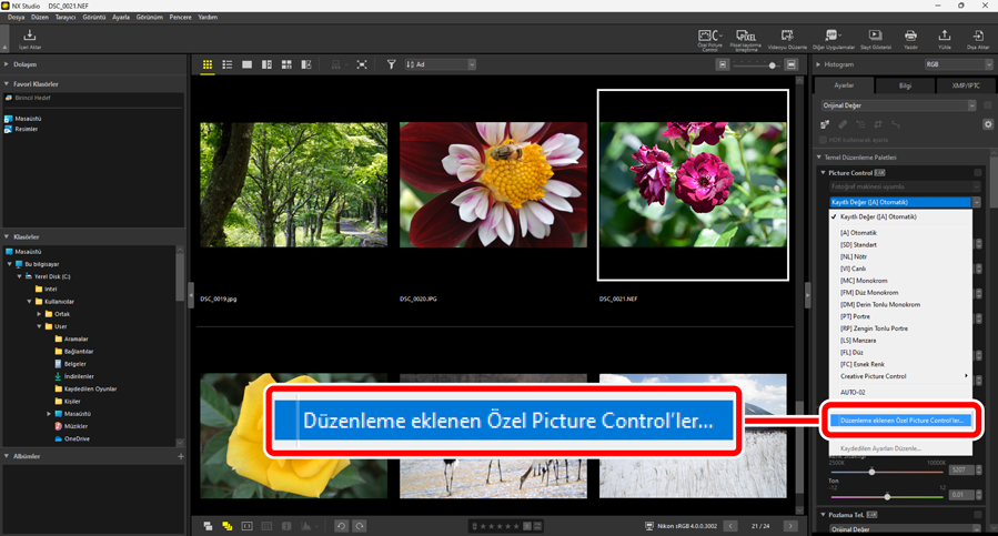 Ayarlar paletindeki [Picture Control] içinde ayarlanan Picture Control’ler NX Studio’da Özel Picture Control’ler olarak kaydedilebilir. Kaydedilen Özel Picture Control’ler [Picture Control] açılır menüsünden seçilerek görüntülere uygulanabilir.