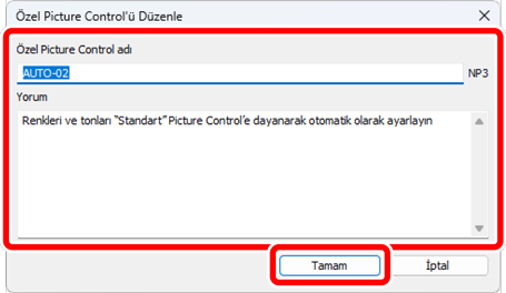 [Özel Picture Control’ü Düzenle] diyaloğunda, Özel Picture Control’ü adlandırın ve bir yorum ekleyin, ardından [Tamam] öğesine tıklayın.