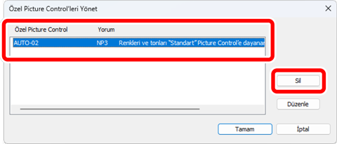 [Özel Picture Control’leri Yönet] diyaloğunda, bir Özel Picture Control seçin ve [Sil] öğesine tıklayın.
