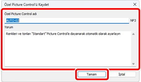 [Özel Picture Control’ü Kaydet] diyaloğunda, Özel Picture Control’ü adlandırın ve bir yorum ekleyin, ardından [Tamam] öğesine tıklayın.