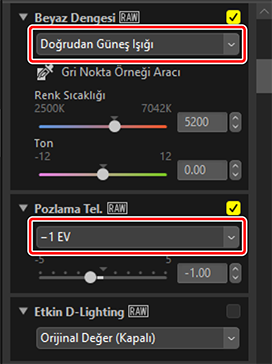 Ayarlar paletinde ayarları yapın. Burada [Beyaz Dengesi] seçeneğini [Doğrudan Güneş Işığı] olarak, [Pozlama Tel.] seçeneğini ise [−1 EV] olarak ayarladık.