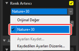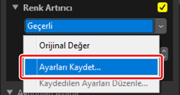 Geçerli ayarlar her bir araçtaki menülere eklenebilir. Ayarlar o zaman menüden seçilebilir ve diğer resimlere uygulanabilir. Aşağıdaki metinde gösterme amaçlı olarak [Renk Artırıcı] aracı kullanılmaktadır.
