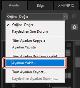 Ayarlamalar yöneticisinde [Ayarları Yükle] öğesini seçin, 2. Adımda oluşturduğunuz dosyayı seçin ve seçilen ayarlamaları geçerli seçimdeki tüm resimlere uygulamak için [Açık] öğesine tıklayın.