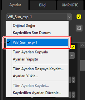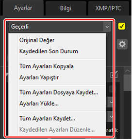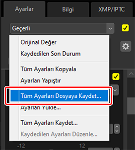 Tüm ayarlamaları bir ayarlamalar dosyasına kaydetmek için [Tüm Ayarları Dosyaya Kaydet] seçeneğini kullanın. Dosya ardından mevcut seçimdeki resimlere [Ayarları Yükle] seçeneği kullanılarak yüklenebilir ve uygulanabilir. Ayarlama dosyaları ayrıca diğer bilgisayarlarda kullanılmak üzere de kopyalanabilir.