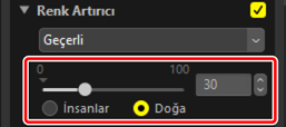 Bir araç seçin ve ayarlar paletindeki ayarları yapın. Burada [Doğa] öğesini seçtik kaydırma çubuğunu +30 olarak ayarladık.