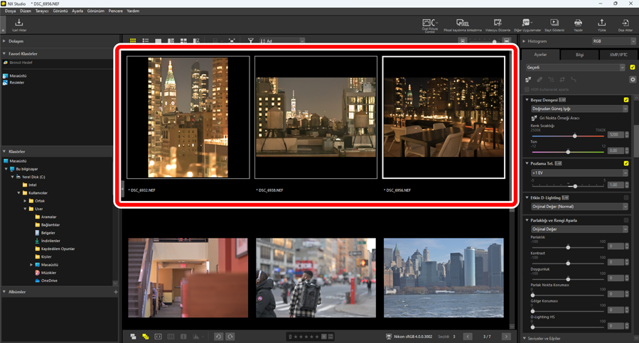 Resimleri seçin. Bu örnekte, seçilen resim [Pozlama Tel.] ve [Etkin D-Lighting] araçları kullanılarak önceden ayarlanmıştır.