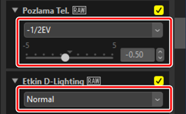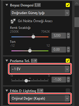 Ayarlar seçilen resimlere uygulanır. [Etkin D-Lighting], [Orijinal Değer (Kapalı)] seçeneğine geri dönerken, [Pozlama Tel.] 1. Adımda seçilen değere değişir.