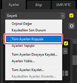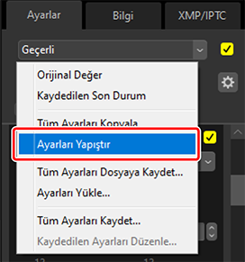 Ayarlar RAW görüntülerden veya birleştirilmiş piksel kaydırma görüntülerinden JPEG, HEIF veya TIFF görüntülere kopyalandığında, [Pozlama Tel.], [Picture Control] ve yalnızca RAW görüntüler veya birleştirilmiş piksel kaydırma görüntüleri ile kullanılabilen diğer ayarlar uygulanmayacaktır.