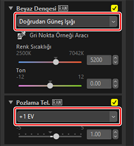 Ayarlar paletinde ayarları yapın. Burada [Beyaz Dengesi] seçeneğini [Doğrudan Güneş Işığı] olarak, [Pozlama Tel.] seçeneğini ise [+1 EV] olarak ayarladık.
