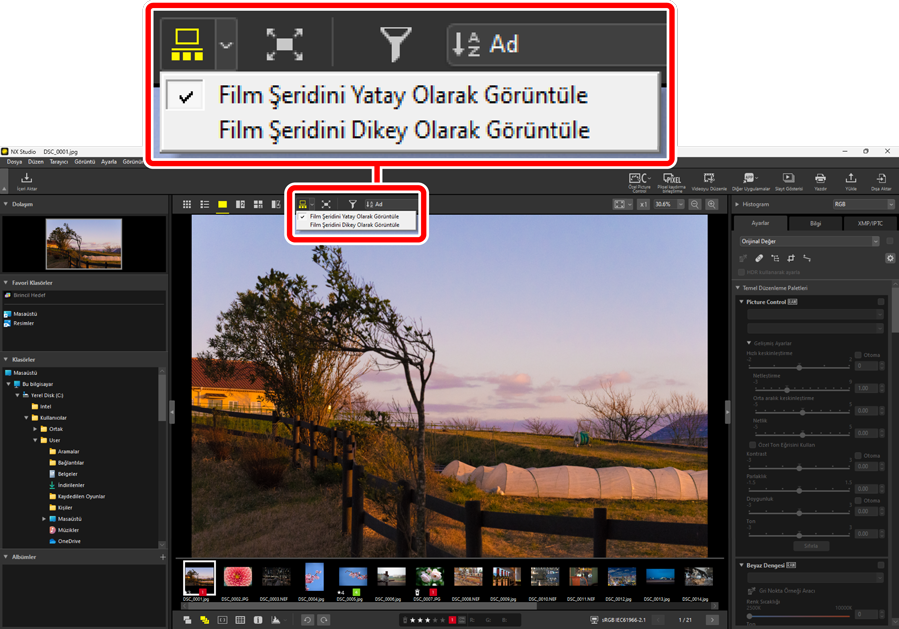 öğesine tıklayarak değiştirebilirsiniz. Yön, film şeridi görüntüleyicinin altında görüntülendiğinde