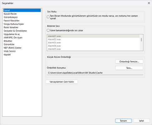 - [İşlem tamamlandığında ses çıkar] seçilirse NX Studio işlem tamamlandığında bir ses çıkaracaktır. Ses listeden seçilebilir.
