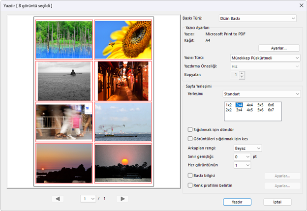 - [Standart]: Sayfa başına yazdırılacak resim sayısını bir liste kutucuğundan seçin. Resimlerin boyutu seçilen seçeneğe göre otomatik olarak ayarlanır.