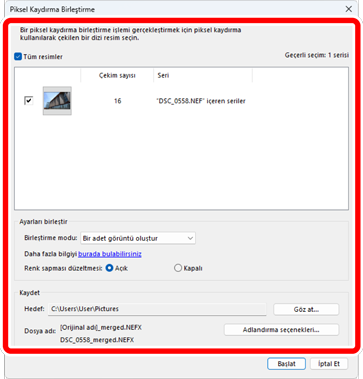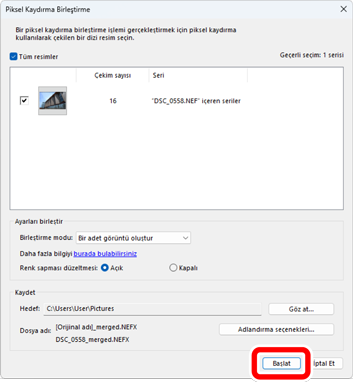 Birleştirilen görüntüyü (birleştirilmiş piksel kaydırma görüntüsü) hedef klasöre kaydetmek için [Başlat] öğesine tıklayın.