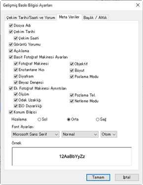 - [Font Ayarları]: Meta veriler yazdırmak için kullanılan yazı tipini, stilini ve punto boyutunu seçin.