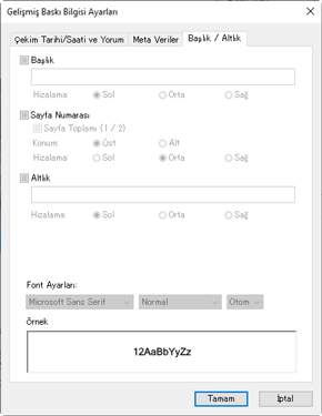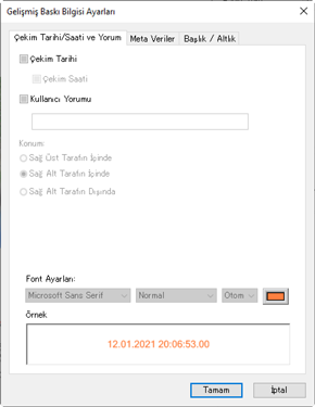 - [Font Ayarları]: Tarih/saat damgasını yazdırmak için kullanılacak yazı tipini, stili, yazı tipi punto boyutunu ve rengi seçin.