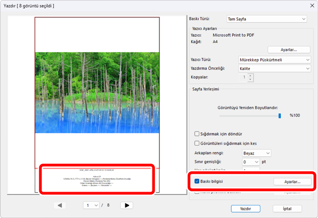 Her resmin altına yazdırılacak bilgileri seçmek için “Yazdır” diyaloğunda [Baskı bilgisi] öğesini seçin ve [Ayarlar] öğesine tıklayın.