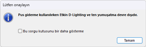 [Pus giderme] seçeneğini etkinleştirmek [Etkin D-Lighting] ve [Ten yumuşatma] seçeneklerini devre dışı bırakır.