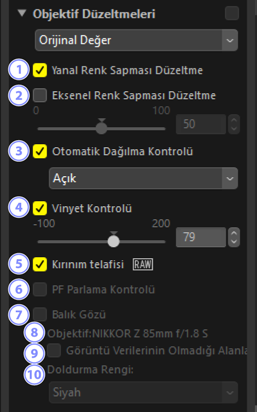 Geniş açı objektifleri ile ilişkili fıçı bükülmesi ve telefoto objektifleri ile ilişkili yastık bükülmesini azaltmak üzere fotoğraflarla kaydedilen objektif bilgilerini kullanmak için bu seçeneği seçin.