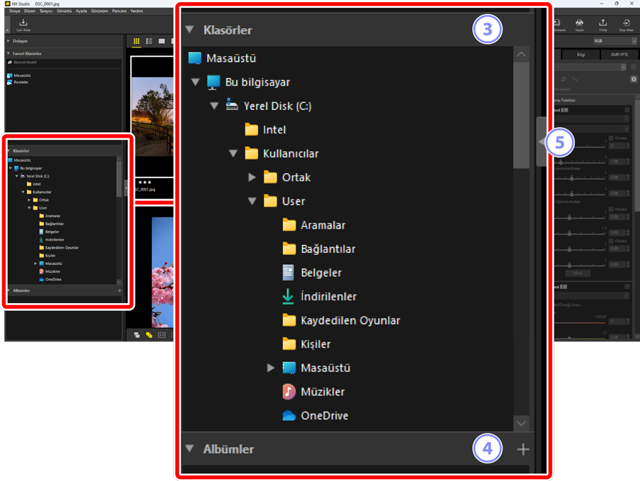 düğmelerine tıklayarak [Dolaşım], [Favori Klasörler], [Klasörler] ve [Albümler] alt paletleri görüntülenebilir veya gizlenebilir.