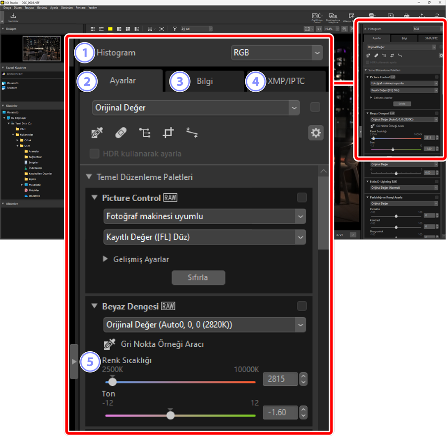 - Seçilen resimler için görüntü bilgilerini ve ayarlamaları gösterir.